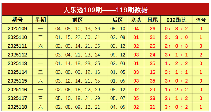 大乐透第2025118期出奖号统计:前区02、08、09、12、21,后区04、05。龙头02,凤尾21,012路比为3:0:2,开出1组连号。