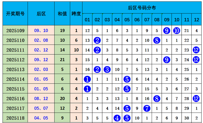 上期后区开出奖号04、05,奇偶比1:1,近10期奇偶比10:10,奇偶数奖号开出平衡,本期推选奇偶比1:1,参考后区号码10、11。